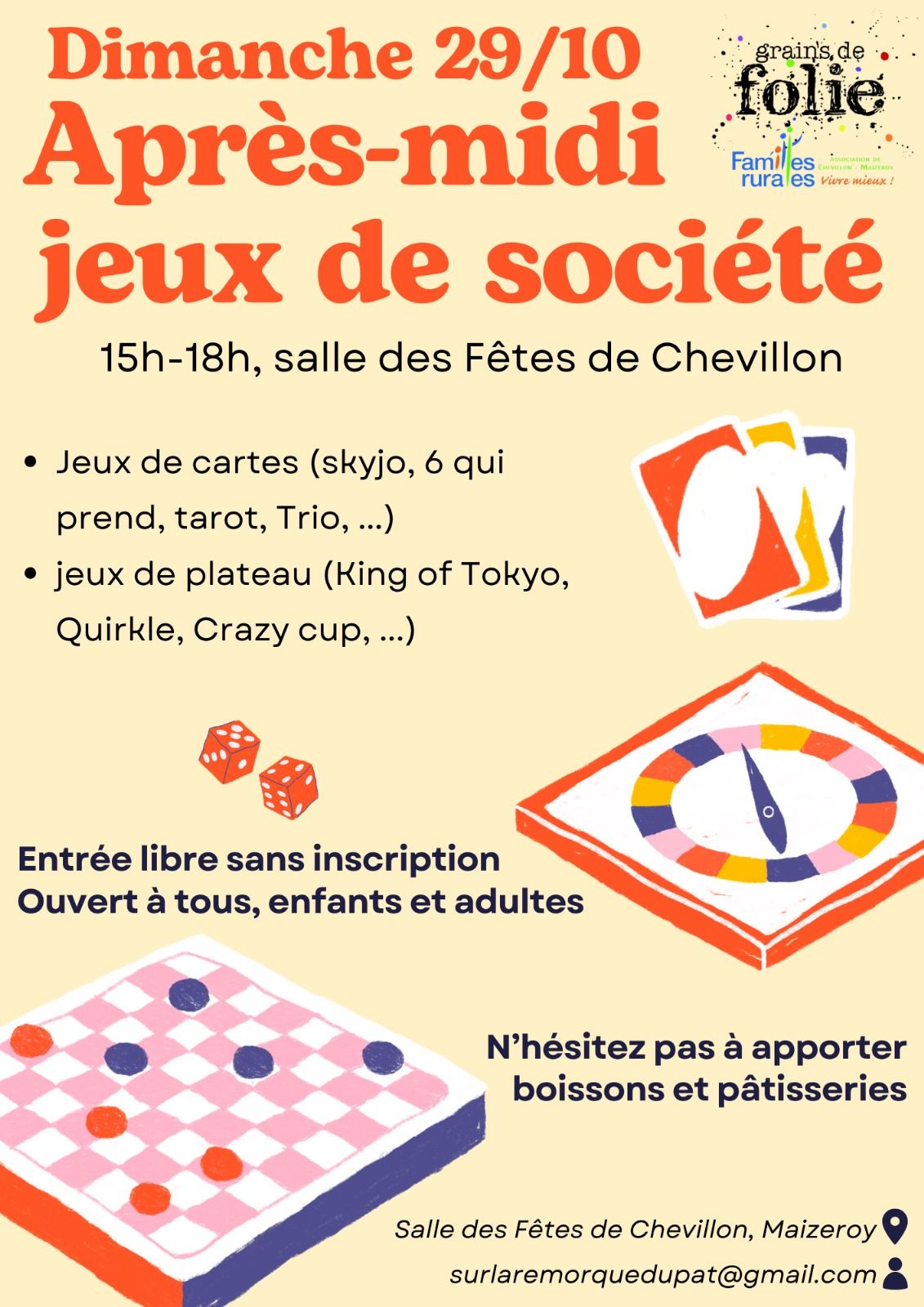 Organisée par l'association Familles Rurales Grains de Folies le dimanche 29 octobre 2023 de 15h à 18h à la salle des Fêtes de Chevillon.