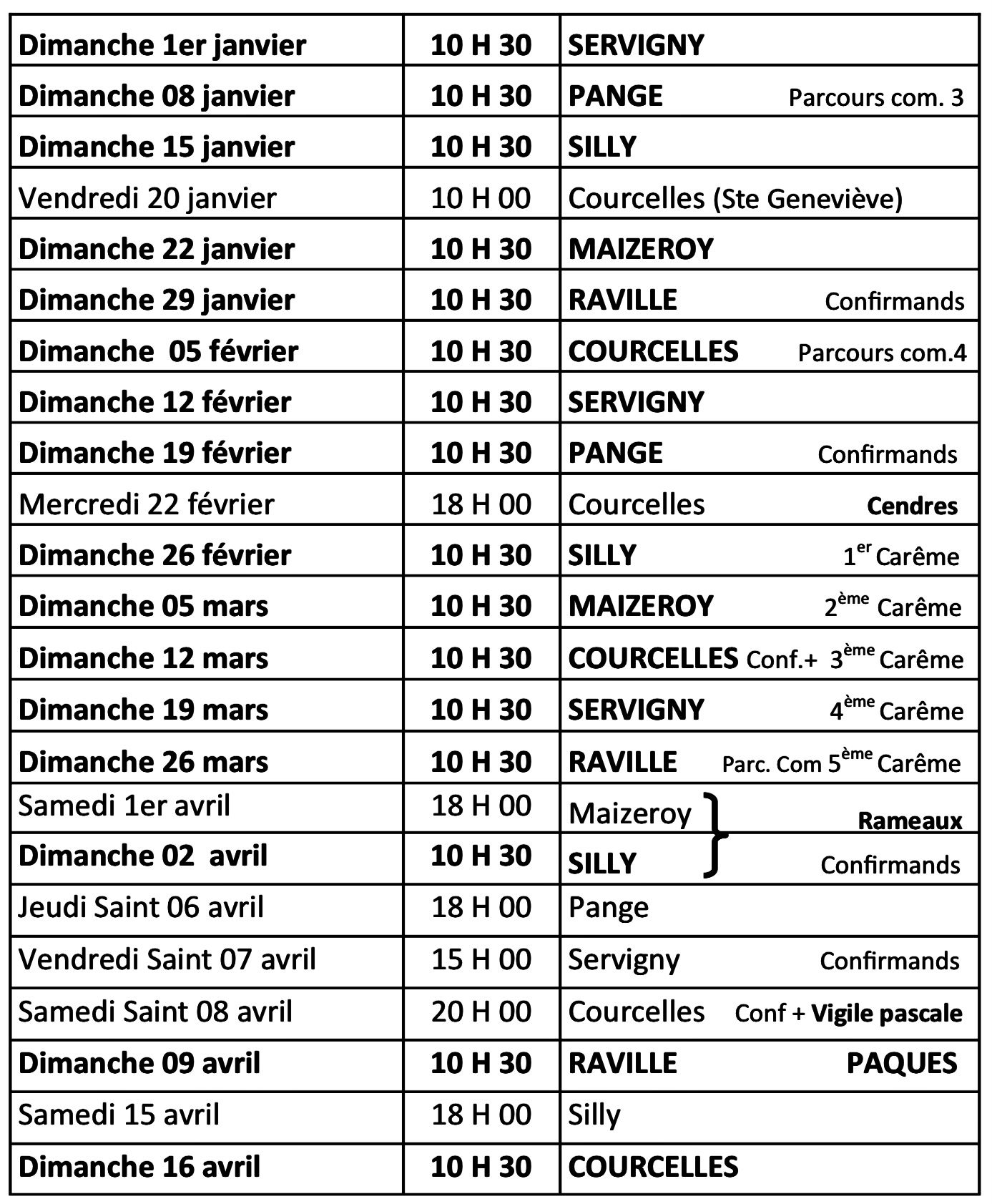 Planning des messes du 1er janvier au 25 juin 2023